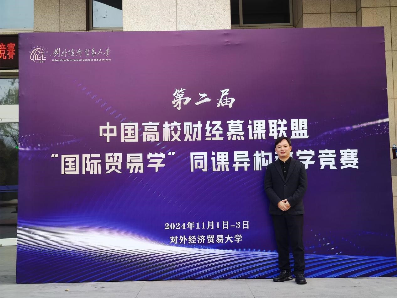 2024年11月2日至3日,第二屆中國高校財經(jīng)慕課聯(lián)盟“國際貿(mào)易學(xué)”同課異構(gòu)教學(xué)競賽在對外經(jīng)濟(jì)貿(mào)易大學(xué)舉行。此次教學(xué)競賽以“數(shù)智賦能”為主題,探索打造智慧課程。我院符大海副教授代表《國際貿(mào)易學(xué)》課程團(tuán)隊參加本次賽事。在11月2日舉行的復(fù)賽階段,由全國25所財經(jīng)類院校推薦的參賽選手同臺競技,共評選出8名教師進(jìn)入決賽。我院符大海副教授以復(fù)賽成績第一名出線后參加了11月3日舉行的決賽,并最終獲得此次教學(xué)競賽一等獎。