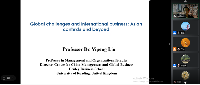 講座的前半場,劉毅鵬教授開展題為《全球大挑戰(zhàn)與國際商務:亞洲情境及其拓展》的精彩演講。劉教授認為,在當今面臨的全球大挑戰(zhàn)中,國際商務研究可以從危機管理、可持續(xù)發(fā)展以及亞洲情境等話題進行拓展,相關研究具有較高的理論價值和實踐意義。此后,劉教授分享了他與合作者在《Asian Business and Management》雜志上最新發(fā)表的論文《The challenges and opportunities of a global health crisis: the management and business implications of COVID?19 from an Asian perspective》以及他最近的案例研究《Global uncertainty and Tiktok M&A deal》。劉教授提到,亞洲的情境和中國的故事在國際商務研究中仍有很多研究機會,例如疫情下的企業(yè)彈性和組織靈活性問題、全球價值鏈格局與中國參與、全球人才管理以及數字經濟與戰(zhàn)略轉型等都是未來國際商務重要的研究方向。
