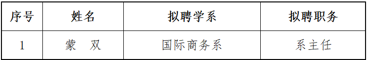 根據(jù)《國際經(jīng)濟(jì)與貿(mào)易學(xué)院學(xué)系主任工作管理辦法》,經(jīng)老師自愿提交書面申請,全院老師和國際商務(wù)系老師民主測評,學(xué)院黨委會和黨政聯(lián)席會議討論通過,同意國際商務(wù)系主任擬聘人選。現(xiàn)進(jìn)行聘任前公示。公示事項(xiàng)如下:
