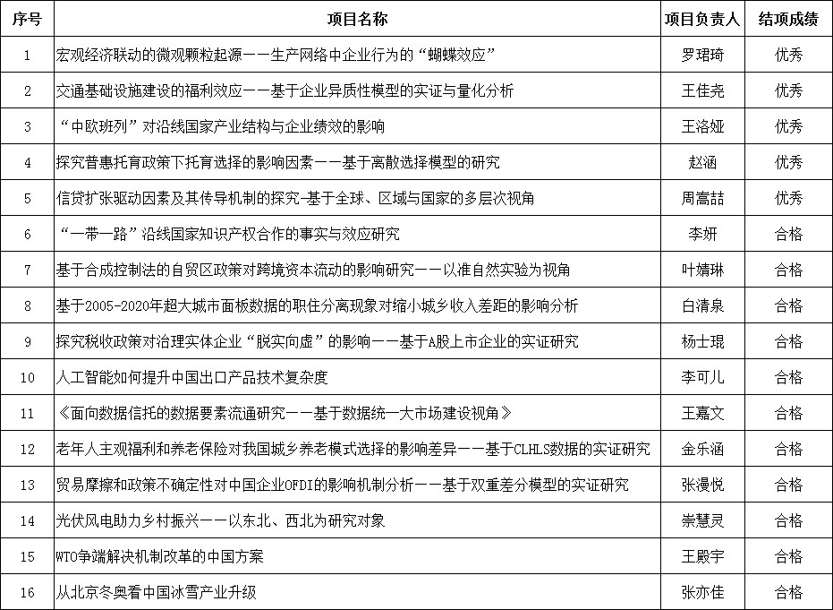 根據(jù)教務處《關(guān)于做好2022-2023學年大學生創(chuàng)新創(chuàng)業(yè)訓練計劃項目結(jié)項驗收工作的通知》(教字[2023]35號)有關(guān)規(guī)定,國際經(jīng)濟與貿(mào)易學院組織了2022年度大學生創(chuàng)新訓練計劃項目結(jié)項驗收工作,最終的結(jié)項驗收結(jié)果如下: