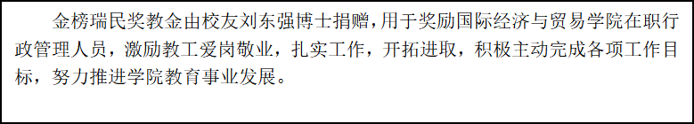 根據(jù)《國(guó)際經(jīng)濟(jì)與貿(mào)易學(xué)院金榜瑞民獎(jiǎng)教金評(píng)定細(xì)則》的有關(guān)要求,現(xiàn)將國(guó)際經(jīng)濟(jì)與貿(mào)易學(xué)院金榜瑞民獎(jiǎng)教金申報(bào)和評(píng)審工作通知如下: