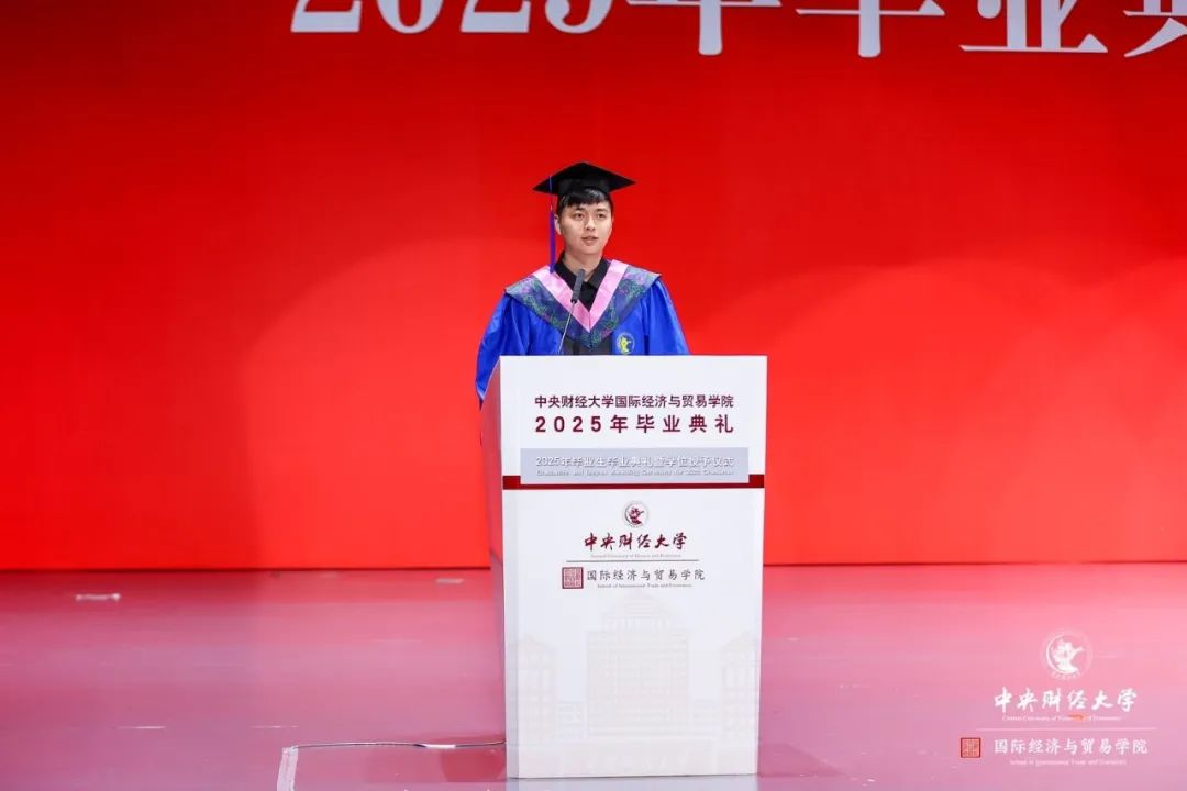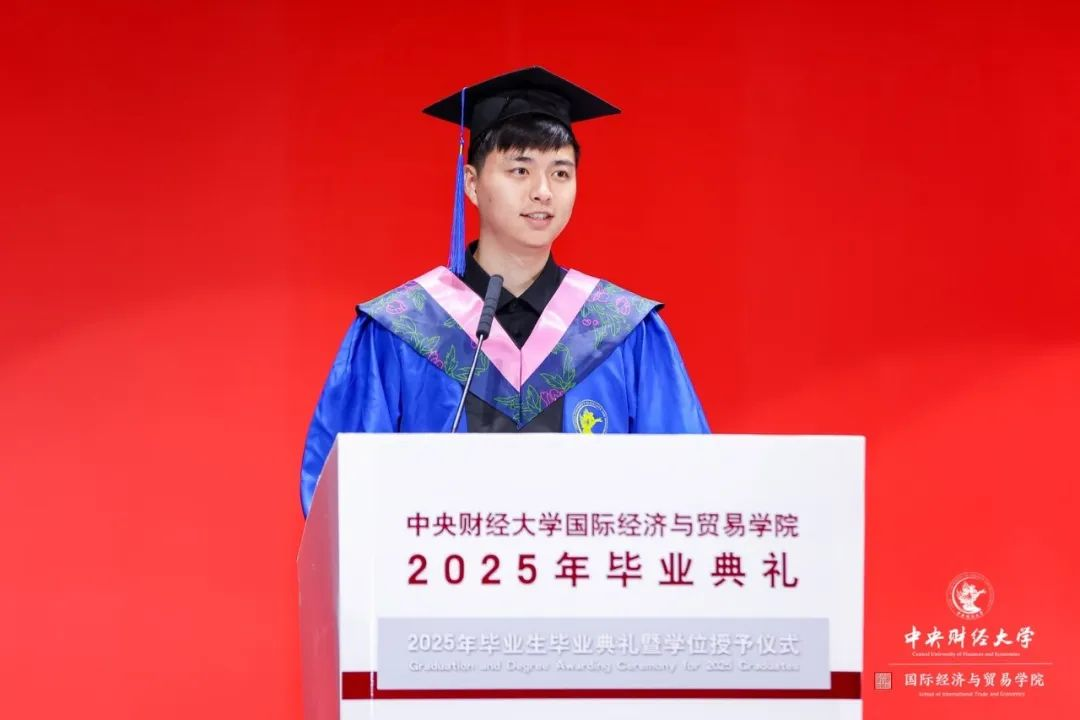 我是2025屆國(guó)際貿(mào)易學(xué)專(zhuān)業(yè)的碩士研究生趙建銘,非常榮幸能夠作為全體畢業(yè)研究生代表在這里發(fā)言。首先,請(qǐng)?jiān)试S我代表2025屆畢業(yè)生們,向我們深?lèi)?ài)的學(xué)校和學(xué)院獻(xiàn)上最誠(chéng)摯的祝福!向傳道授業(yè)、無(wú)私奉獻(xiàn)的老師們致以最崇高的敬意!正是您們的悉心栽培,才成就了今天坐在這里的我們!