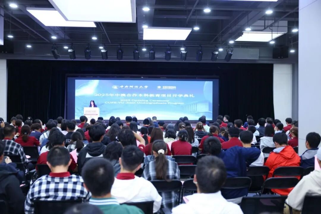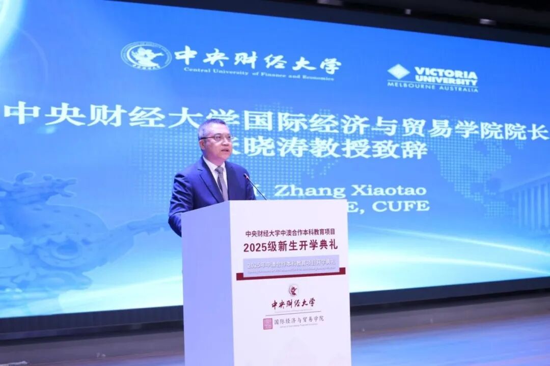9月22日下午,2025級(jí)國(guó)際經(jīng)濟(jì)與貿(mào)易學(xué)院中澳合作本科教育項(xiàng)目(以下簡(jiǎn)稱“中澳合作項(xiàng)目”)新生開學(xué)典禮在中央財(cái)經(jīng)大學(xué)沙河校區(qū)融想大廳隆重舉行。出席典禮的維多利亞大學(xué)代表有副校長(zhǎng)羅伯·斯特拉蒂教授、跨國(guó)教育項(xiàng)目主任卡琳·內(nèi)里女士、跨國(guó)教育教學(xué)部主任拉奎爾·里恰爾迪女士、英語(yǔ)中心主任黛安娜·麥基尼女士、跨國(guó)教育項(xiàng)目經(jīng)理岳濤先生及合作協(xié)調(diào)員迪航·泰特女士。出席此次典禮的中央財(cái)經(jīng)大學(xué)校方代表有中央財(cái)經(jīng)大學(xué)副校長(zhǎng)李濤、國(guó)際經(jīng)濟(jì)與貿(mào)易學(xué)院院長(zhǎng)張曉濤、黨委書記徐淼、副院長(zhǎng)李瑞琴、中央財(cái)經(jīng)大學(xué)國(guó)際合作處副處長(zhǎng)郭楓、學(xué)院教師代表、全體輔導(dǎo)員,中澳項(xiàng)目校友代表、2020屆畢業(yè)生、中央國(guó)債登記結(jié)算有限責(zé)任公司林茂出席了此次典禮。典禮由副院長(zhǎng)李瑞琴主持,在雄壯的中華人民共和國(guó)國(guó)歌中拉開帷幕。