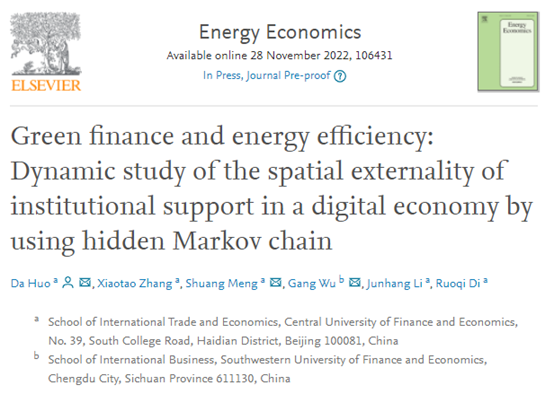 我院國際商務系霍達教授、張曉濤教授、蒙雙副教授與西南財經(jīng)大學吳鋼副教授、我院國際商務碩士研究生李君航、國際商務本科專業(yè)生邸偌祺合作(同等貢獻,共同第一作者)的研究成果“Green Finance and Energy Efficiency: Dynamic Study of the Spatial Externality of Institutional Support in a Digital Economy by Using Hidden Markov Chain”近日被能源經(jīng)濟學頂刊Energy Economics(中財外文AA)接受發(fā)表。