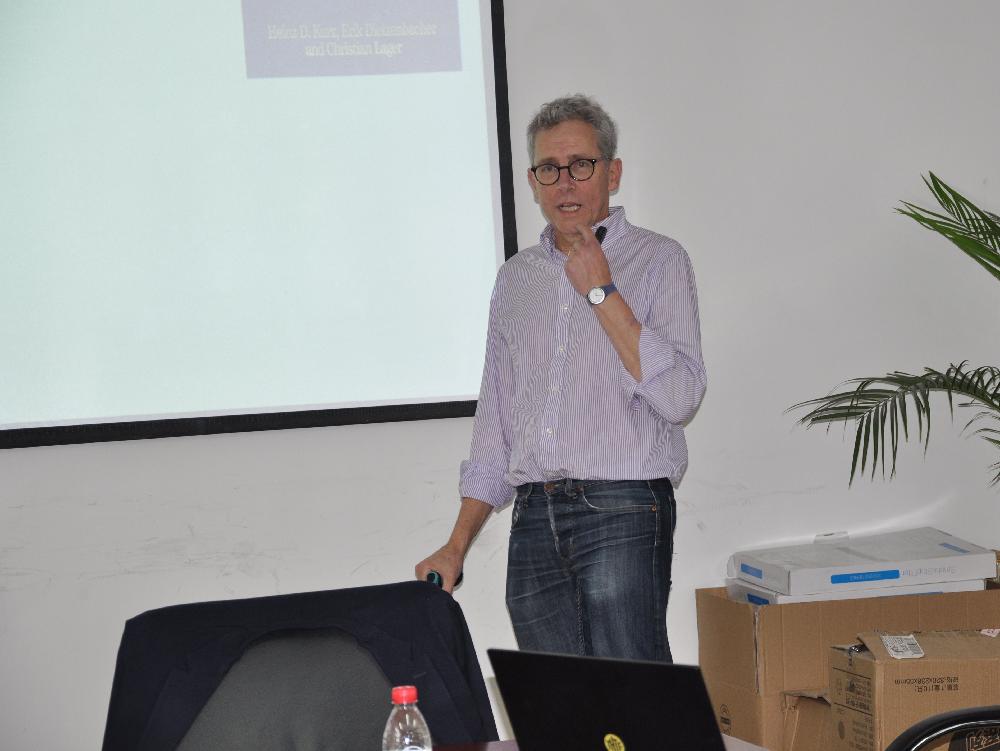 講座中,Dietzenbacher教授從歷史維度,對全球價值鏈領域的研究背景、研究問題、研究方法、研究結(jié)論和面臨的挑戰(zhàn)進行了系統(tǒng)的梳理、總結(jié)和評價,并重點針對全球價值鏈背景下的環(huán)境生態(tài)問題研究給予了詳細的剖析和講解,對全球價值鏈研究的未來走向和熱點問題進行了判斷和總結(jié)。參會師生與Dietzenbacher教授就講座內(nèi)容進行了深入討論與交流;Dietzenbacher教授生動深入的講解和詼諧幽默的語言極大激發(fā)了在場師生的研討熱情,現(xiàn)場不時發(fā)出共鳴的笑聲,整個講座現(xiàn)場座無虛席、氣氛活躍、討論熱烈。