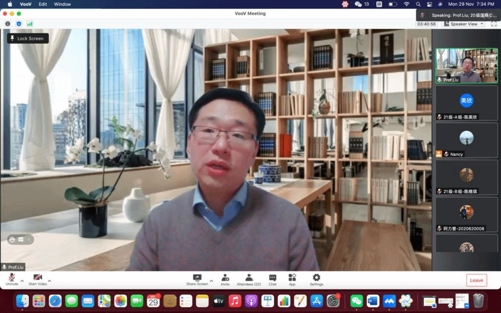 2021年11月29日,國際經(jīng)濟與貿(mào)易學院特聘請英國雷丁大學劉毅鵬教授為學院國際商務(wù)專業(yè)碩士留學生開設(shè)在線國際商務(wù)與中國管理實踐專題講座。本次講座通過騰訊會議平臺開展,面向我院2020和2021級國際商務(wù)專業(yè)碩士留學生。國際合作辦公室閆倩楠老師、國際商務(wù)專業(yè)碩士留學生等共30余人參與本次講座。本次講座得到“中央財經(jīng)大學引智項目”支持。