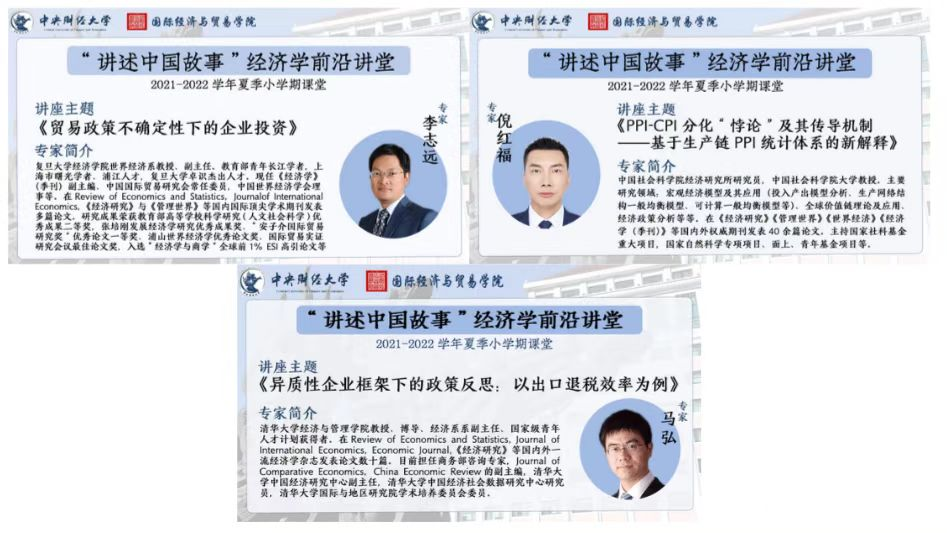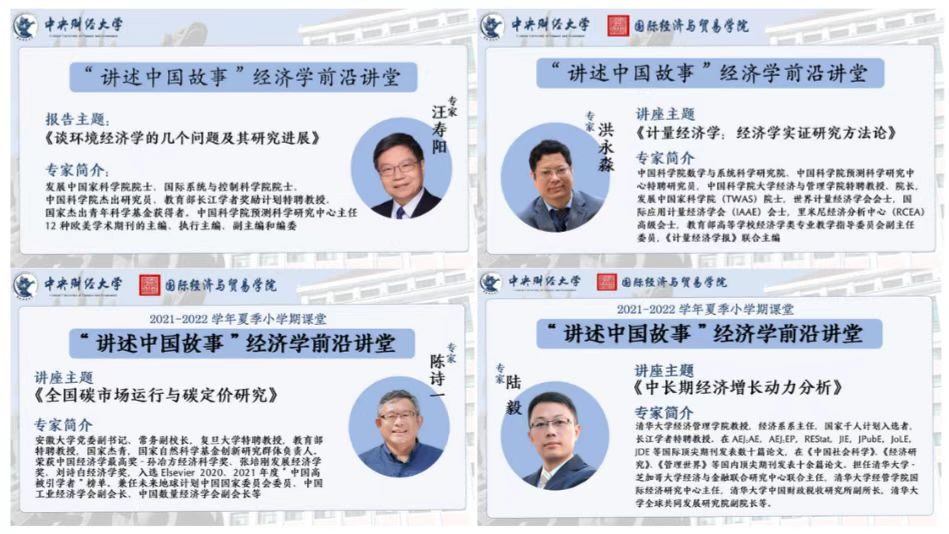 按照學(xué)校“打造小學(xué)期多元化與個(gè)性化育人空間,激發(fā)學(xué)生自主學(xué)習(xí)的積極性和能動(dòng)性,促進(jìn)學(xué)生綜合能力的提升”的指導(dǎo)原則,2021-2022學(xué)年國際經(jīng)濟(jì)與貿(mào)易學(xué)院暑假小學(xué)期課程共開設(shè)三門系列課程,其中,《“講述中國故事”經(jīng)濟(jì)學(xué)前沿講堂》課程邀請(qǐng)到了多位國內(nèi)經(jīng)濟(jì)學(xué)領(lǐng)域頂級(jí)學(xué)術(shù)大家蒞臨授課,演講嘉賓包括:發(fā)展中國家科學(xué)院院士、國際系統(tǒng)與控制科學(xué)院院士、國家杰出青年科學(xué)基金獲得者、長江學(xué)者特聘教授汪壽陽教授;中國科學(xué)院大學(xué)經(jīng)濟(jì)與管理學(xué)院特聘教授、院長、發(fā)展中國家科學(xué)院(TWAS)院士、世界計(jì)量經(jīng)濟(jì)學(xué)會(huì)會(huì)士洪永淼教授;清華大學(xué)經(jīng)濟(jì)管理學(xué)院教授、經(jīng)濟(jì)系系主任、教育部長江學(xué)者特聘教授陸毅教授;安徽大學(xué)黨委副書記、教育部特聘教授、國家杰出青年科學(xué)基金獲得者陳詩一教授;復(fù)旦大學(xué)經(jīng)濟(jì)學(xué)院世界經(jīng)濟(jì)系副主任、教育部青年長江學(xué)者、上海市曙光學(xué)者、浦江人才李志遠(yuǎn)教授;中國社會(huì)科學(xué)院經(jīng)濟(jì)研究所研究員、《經(jīng)濟(jì)研究》編輯部副主任倪紅福教授;清華大學(xué)經(jīng)濟(jì)與管理學(xué)院教授、商務(wù)部咨詢專家、教育部青年長江學(xué)者馬弘教授等。