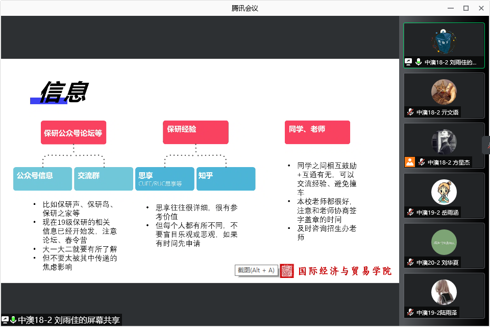 為深入貫徹習(xí)近平總書記重要講話精神,圍繞落實(shí)立德樹人根本任務(wù),將“我為師生辦實(shí)事”落實(shí)到實(shí)處,2021年11月13日下午14時,國際經(jīng)濟(jì)與貿(mào)易學(xué)院中澳項(xiàng)目第二本科生黨支部保研經(jīng)驗(yàn)分享會在線上順利召開,經(jīng)驗(yàn)分享由黨支部3名成功保研的優(yōu)秀同學(xué)劉雨佳(保研至北大經(jīng)院國商專碩)、王銘潔(保研至北大經(jīng)院國商專碩)、劉天宇(支教保至國貿(mào)學(xué)院國商專碩)向大家介紹保研路上的相關(guān)經(jīng)驗(yàn),支部入黨積極分子、發(fā)展對象及預(yù)備黨員參加了此次活動。