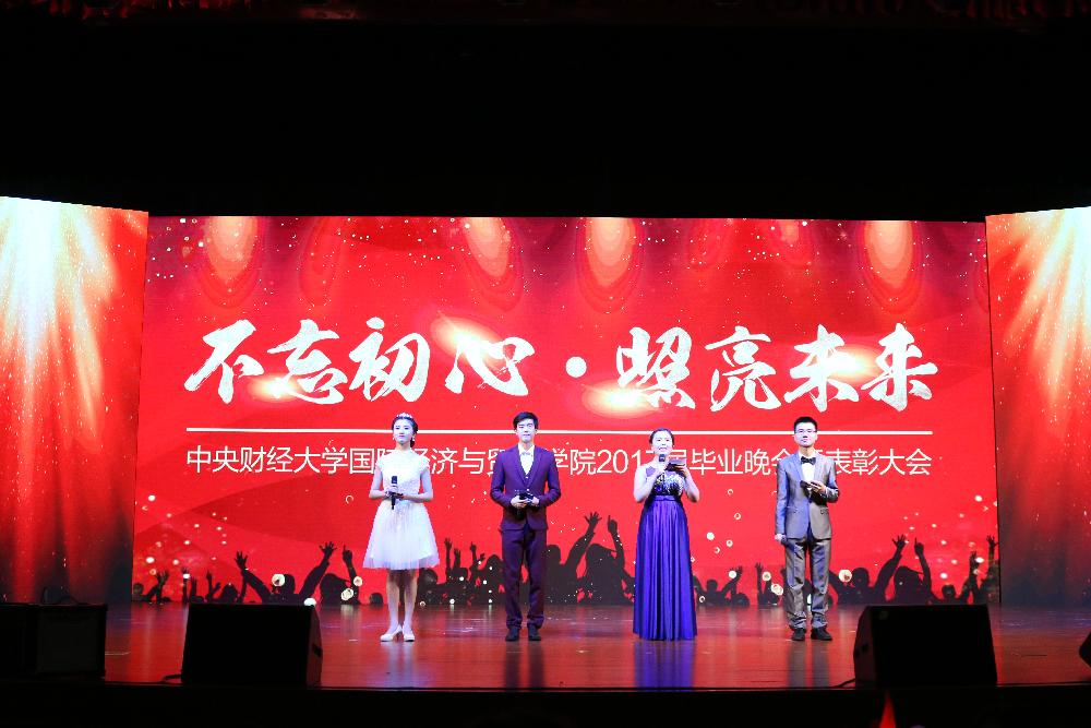 2017年6月14日,中央財(cái)經(jīng)大學(xué)國(guó)際經(jīng)濟(jì)與貿(mào)易學(xué)院在學(xué)院南路校區(qū)學(xué)術(shù)會(huì)堂206成功舉辦了以“不忘初心,照亮未來”為主題的2017屆畢業(yè)晚會(huì)暨表彰大會(huì)。院長(zhǎng)唐宜紅,黨委副書記李瑞琴,副院長(zhǎng)符大海,副院長(zhǎng)王立勇,特邀嘉賓學(xué)生處副處長(zhǎng)陳振,校友總會(huì)副秘書長(zhǎng)李松莉,國(guó)際文化交流學(xué)院學(xué)生工作辦公室主任丁國(guó)英老師以及一直在教學(xué)、行政和學(xué)工一線學(xué)生成長(zhǎng)的20余名老師和全體畢業(yè)生們、獲獎(jiǎng)代表共同參加了盛會(huì)。