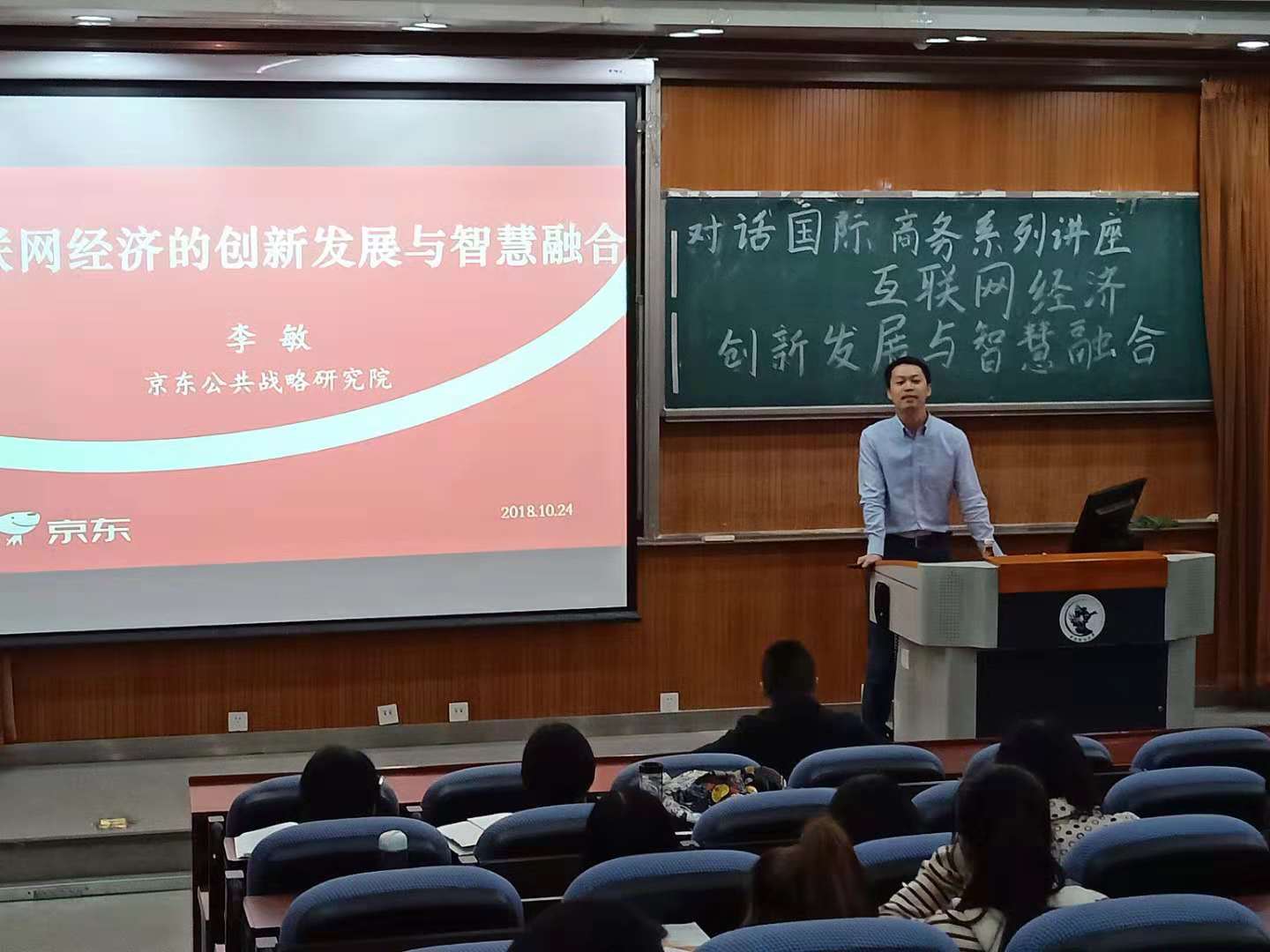 2018年10月24日晚,“對(duì)話國際商務(wù)”系列講座第十場在沙河校區(qū)東區(qū)學(xué)院樓3號(hào)樓222教室成功舉行。本場講座非常榮幸的邀請(qǐng)到京東公共戰(zhàn)略研究院高級(jí)研究院李敏博士擔(dān)任主講嘉賓。李敏博士的主要研究方向包括互聯(lián)網(wǎng)經(jīng)濟(jì)、企業(yè)戰(zhàn)略、電子商務(wù)等,本次主講的題目為“互聯(lián)網(wǎng)經(jīng)濟(jì)的創(chuàng)新發(fā)展與智慧融合”。講座由國際經(jīng)濟(jì)與貿(mào)易學(xué)院國際商務(wù)系主任霍達(dá)副教授主持。