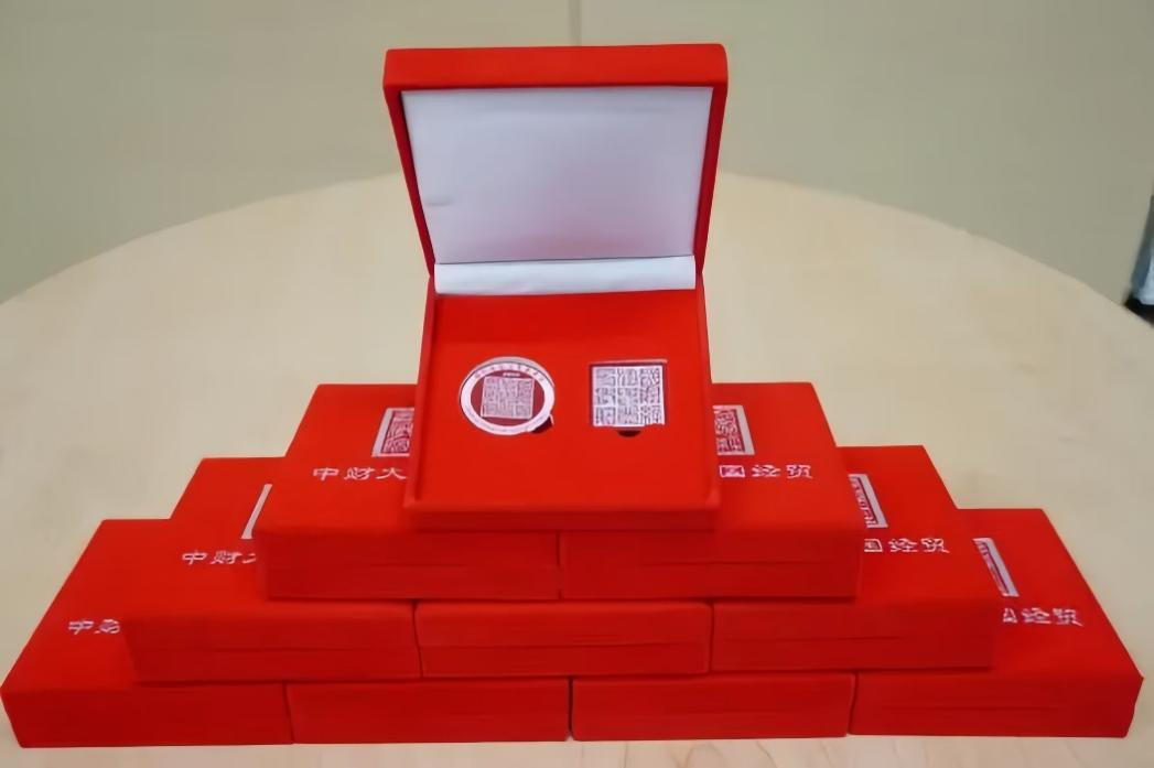 兩枚徽章,沉甸甸的不僅是材質(zhì)的重量,更是學院歷史與榮耀的見證。它們以朱紅色調(diào),講述著國貿(mào)的輝煌過去,并預示著更加燦爛的未來。篆書字體的學院印鑲嵌其上,不僅代表著中華文化的深厚傳承,更寓含著中財大“為國而生、與國同行”的財經(jīng)報國紅色基因,紅字的閃耀寓意著這一精神血脈的賡續(xù)。