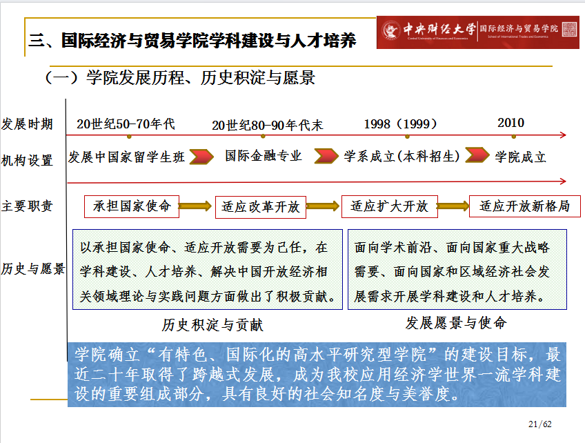 再次,張?jiān)洪L(zhǎng)向同學(xué)們?cè)敿?xì)介紹學(xué)院發(fā)展歷程、歷史積淀與愿景。70多年來(lái),中財(cái)大國(guó)際經(jīng)濟(jì)與貿(mào)易及相關(guān)學(xué)科在不同的歷史時(shí)期以承擔(dān)國(guó)家使命、適應(yīng)開放需要為己任,在學(xué)科建設(shè)、人才培養(yǎng)、解決中國(guó)開放經(jīng)濟(jì)相關(guān)領(lǐng)域理論與實(shí)踐問(wèn)題方面做出了積極貢獻(xiàn)。近二十年來(lái)取得了跨越式發(fā)展,學(xué)院確立“有特色、國(guó)際化的高水平研究型學(xué)院”的建設(shè)目標(biāo),最近二十年取得了跨越式發(fā)展,成為我校應(yīng)用經(jīng)濟(jì)學(xué)世界一流學(xué)科建設(shè)的重要組成部分,具有良好的社會(huì)知名度與美譽(yù)度。
