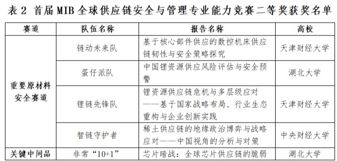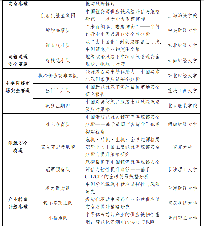 本屆競賽緊扣國家“增強(qiáng)產(chǎn)業(yè)鏈供應(yīng)鏈自主可控能力”的重點(diǎn)任務(wù),圍繞“重要原材料安全”“關(guān)鍵中間品安全”“運(yùn)輸通道安全”“主要目標(biāo)市場安全”“能源安全”及“產(chǎn)業(yè)轉(zhuǎn)型升級”6個核心賽道展開。大賽歷時6個月,共收到來自全國74所高校的183篇參賽作品。參賽作品以供應(yīng)鏈安全與管理的真實(shí)痛點(diǎn)為切入點(diǎn),提出兼具理論深度與實(shí)踐價值的解決方案,為構(gòu)建自主可控的供應(yīng)鏈體系提供了創(chuàng)新思路,充分彰顯了高校在服務(wù)國家重大需求中的使命擔(dān)當(dāng)。