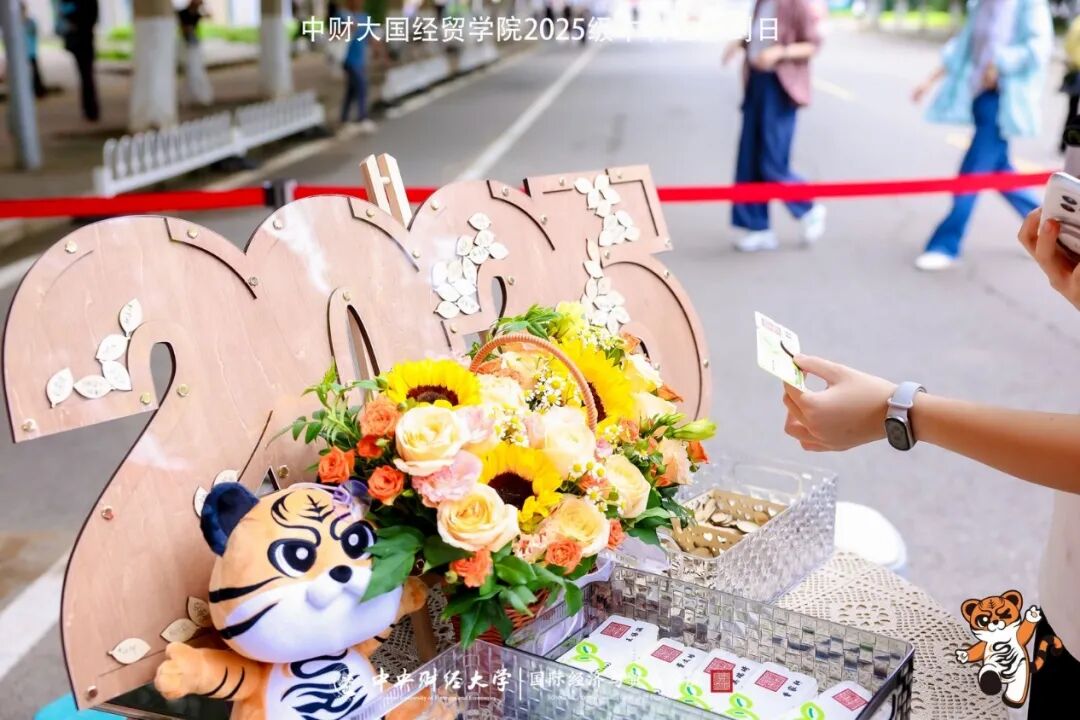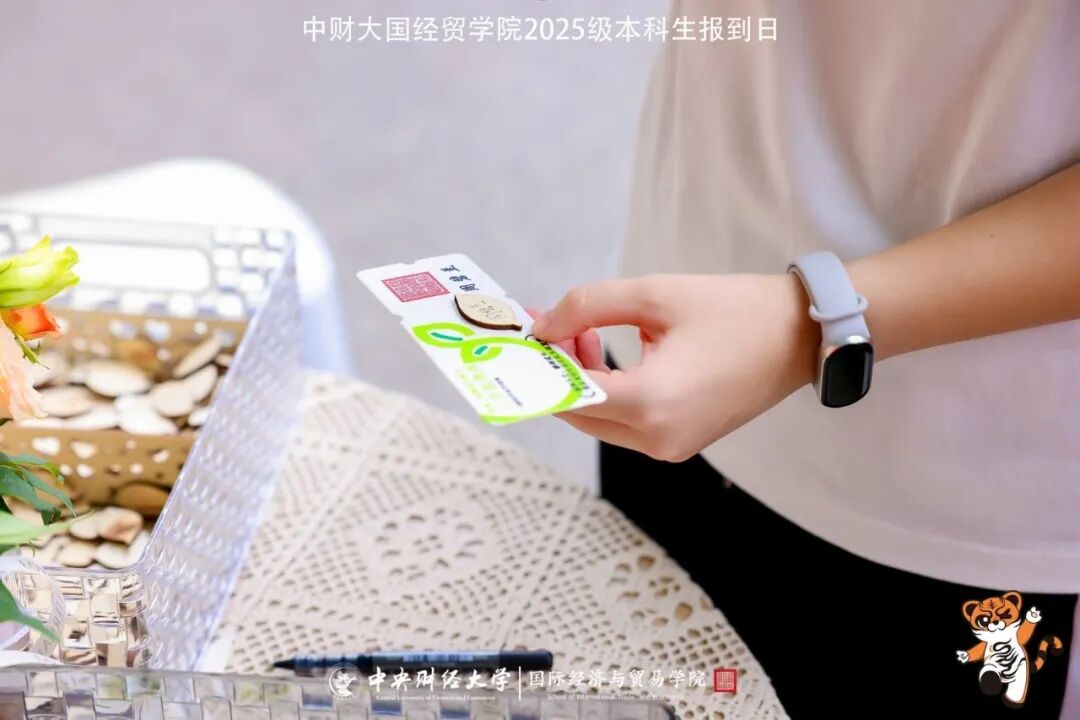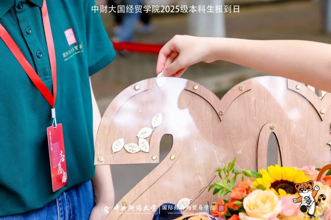 此次迎新,學(xué)院特意為新生同學(xué)們準(zhǔn)備了迎新紀(jì)念禮物。志愿者們贈(zèng)予新生印有國貿(mào)學(xué)院吉祥物貿(mào)貿(mào)虎的帆布袋、精致的學(xué)院徽章、玲瓏的貿(mào)貿(mào)虎鑰匙扣、學(xué)院特別編制的《茂才易學(xué),四季耕讀:國際經(jīng)濟(jì)與貿(mào)易學(xué)院本科生分年級發(fā)展指南》,以及印有新生名字的“種子門票”。“種子門票”放入泥土中可抽芽生枝,預(yù)示著夢想的種子將在國貿(mào)學(xué)院的沃土中生根發(fā)芽。新生將帶著美好的祝愿,踏上大學(xué)之旅。此外,新生們在木刻葉片上簽名,投入形為“2025”的透明容器。國貿(mào)學(xué)院似一棵大樹,新生是一片片葉,從大樹中獲得養(yǎng)分,也為大樹裝點(diǎn)容貌。