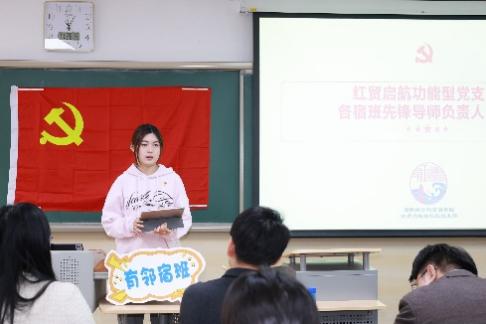 紅貿(mào)啟航功能型黨支部各宿班先鋒導(dǎo)師負(fù)責(zé)人依次作階段性工作匯報(bào)。各宿班先鋒導(dǎo)師通過(guò)線上線下多形式交流實(shí)現(xiàn)新生幫扶的積極成效,同時(shí)針對(duì)現(xiàn)存問(wèn)題提出精準(zhǔn)對(duì)接需求、創(chuàng)新活動(dòng)載體、加強(qiáng)聯(lián)動(dòng)協(xié)作等改進(jìn)計(jì)劃。