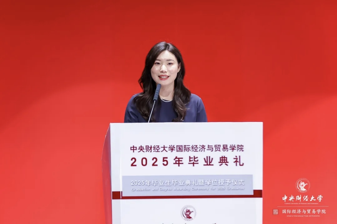 國(guó)際經(jīng)濟(jì)與貿(mào)易學(xué)院本科畢業(yè)生代表、國(guó)際經(jīng)濟(jì)與貿(mào)易21班韓佳儀同學(xué)發(fā)言。她深情回顧四年大學(xué)生活:同學(xué)們?cè)趪?guó)際商務(wù)談判中展現(xiàn)跨文化自信,在學(xué)術(shù)項(xiàng)目中追求創(chuàng)新,在“格致?博雅”論壇對(duì)話頂尖學(xué)者,成長(zhǎng)為兼具國(guó)際視野與本土情懷的新時(shí)代經(jīng)貿(mào)人才。無(wú)論是深造、扎根基層,還是服務(wù)國(guó)際舞臺(tái),國(guó)貿(mào)學(xué)子始終將個(gè)人成長(zhǎng)與國(guó)家發(fā)展同頻共振,以“財(cái)經(jīng)報(bào)國(guó)”踐行擔(dān)當(dāng)。她代表2025屆全體畢業(yè)生感謝母校與師長(zhǎng)的培育,呼吁大家在時(shí)代浪潮中勇?lián)姑瑢?shí)現(xiàn)遠(yuǎn)大理想,并祝愿全體同窗未來(lái)可期。