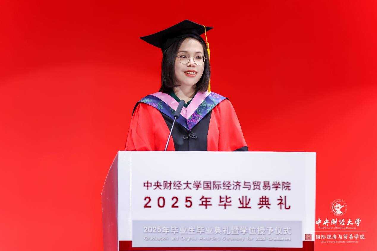 國(guó)際經(jīng)濟(jì)與貿(mào)易學(xué)院教師代表、畢業(yè)班班主任蒙雙副教授發(fā)言。蒙老師回望同學(xué)們?cè)诖髮W(xué)時(shí)光中的蛻變歷程,從初入校園時(shí)的青澀懵懂,到成長(zhǎng)為兼具開(kāi)闊國(guó)際視野、扎實(shí)專(zhuān)業(yè)素養(yǎng)與深厚人文情懷的有為青年。面對(duì)即將踏上新征程的畢業(yè)生,蒙老師結(jié)合百年變局的時(shí)代背景深情寄語(yǔ):一是堅(jiān)持做正確的事,用良知和定力錨定方向。在紛擾中明辨是非,堅(jiān)守底線;二是擁抱不確定性,在變化的風(fēng)浪中鍛造韌性。以勇氣直面挑戰(zhàn),用洞察捕捉機(jī)遇,靠行動(dòng)回應(yīng)變化;三是遠(yuǎn)離內(nèi)耗,為成長(zhǎng)騰出寶貴的心力。她期待畢業(yè)生以所學(xué)所長(zhǎng)開(kāi)拓創(chuàng)新,展現(xiàn)中財(cái)國(guó)貿(mào)人的智慧與風(fēng)骨,并代表學(xué)院承諾:“這里永遠(yuǎn)是大家的溫暖家園”。