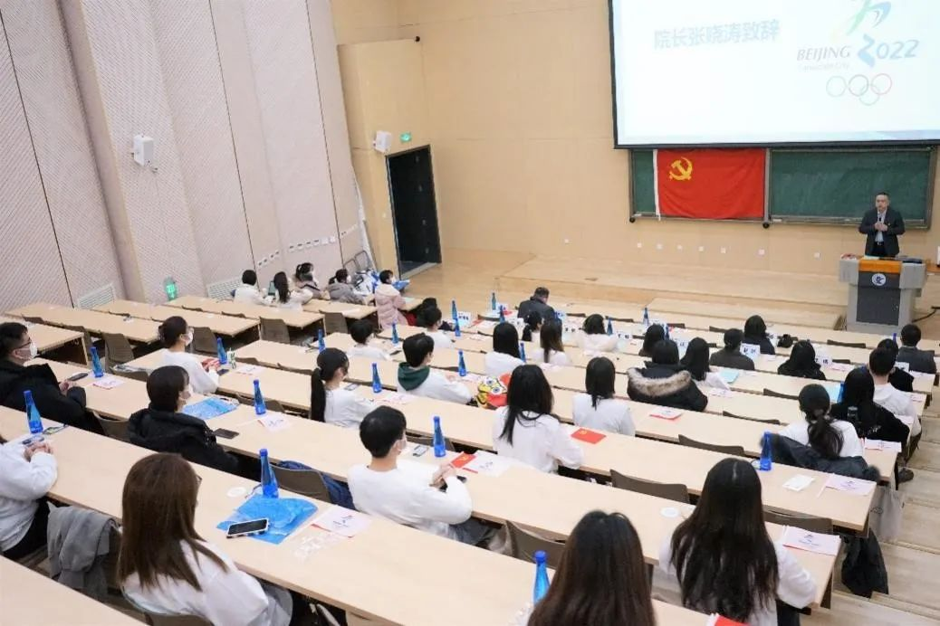 之后,院長(zhǎng)張曉濤致辭。張曉濤老師對(duì)我院學(xué)子一直以來(lái)積極參與志愿服務(wù),在全校范圍內(nèi)的出色表現(xiàn)給予了充分肯定。他表示,國(guó)貿(mào)學(xué)子們此次有機(jī)會(huì)參與冬奧志愿既是幸運(yùn)的,又肩負(fù)著重要責(zé)任,疫情的反復(fù)使得冬奧會(huì)、冬殘奧會(huì)運(yùn)行管理難度加大,志愿服務(wù)工作難度、強(qiáng)度增加,在此情況下仍有眾多志愿者們踴躍報(bào)名,積極奉獻(xiàn),展現(xiàn)出學(xué)子們的大局觀和高站位。張老師囑托大家在做好疫情防護(hù)的前提下,通過(guò)志愿服務(wù)傳播學(xué)院積極進(jìn)取的文化精神,彰顯學(xué)院形象,踐行“為國(guó)而生,與國(guó)同行”的中財(cái)使命和國(guó)貿(mào)人的擔(dān)當(dāng)。張老師對(duì)志愿服務(wù)工作提出了幾點(diǎn)希望:第一,希望大家注意個(gè)人的身體健康,調(diào)整身心狀態(tài),以良好的精神面貌投入到志愿服務(wù)中去;第二,希望大家遵守賽會(huì)管理規(guī)則,不辱使命,不負(fù)信任,有序開展志愿服務(wù)工作;第三,希望大家在志愿服務(wù)期間合理安排時(shí)間,積極學(xué)習(xí),全面成長(zhǎng)。最后,張老師寄語(yǔ)學(xué)院志愿者扛起青春旗幟,守好國(guó)門安全,在這場(chǎng)我國(guó)主場(chǎng)的國(guó)際賽事上奉獻(xiàn)青春力量。