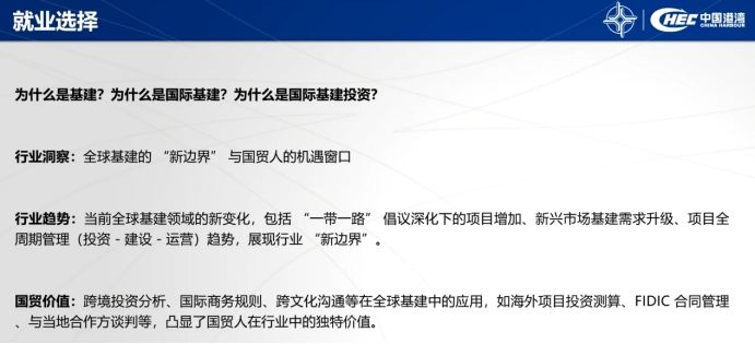 中國港灣工程有限責(zé)任公司的王金斌校友,以“全球基建新邊界與國貿(mào)人的機(jī)遇”為主題,分享了從國際貿(mào)易跨界國際基建投資的職業(yè)歷程。他指出,國貿(mào)專業(yè)學(xué)子不應(yīng)自我設(shè)限。結(jié)合自身海外工作經(jīng)歷,王金斌展示了國貿(mào)人在跨境投資分析、國際合同管理、跨文化溝通等方面的專業(yè)優(yōu)勢,以及這些優(yōu)勢在國際基建領(lǐng)域的獨(dú)特價(jià)值。針對職業(yè)發(fā)展,他提出三點(diǎn)建議:一是夯實(shí)跨境投資、國際商法等專業(yè)基礎(chǔ),這是參與全球業(yè)務(wù)的核心支撐;二是主動(dòng)關(guān)注國家戰(zhàn)略導(dǎo)向行業(yè),打破專業(yè)壁壘,打造復(fù)合能力;三是保持敢闖敢試的心態(tài),不懼海外挑戰(zhàn),在跨領(lǐng)域、跨地域?qū)嵺`中實(shí)現(xiàn)能力進(jìn)階。最后,他寄語學(xué)弟學(xué)妹:“國貿(mào)人的舞臺不止于貿(mào)易領(lǐng)域,將專業(yè)優(yōu)勢與不同行業(yè)需求深度融合,就能在全球基建等新興領(lǐng)域找到職業(yè)突破點(diǎn)。”