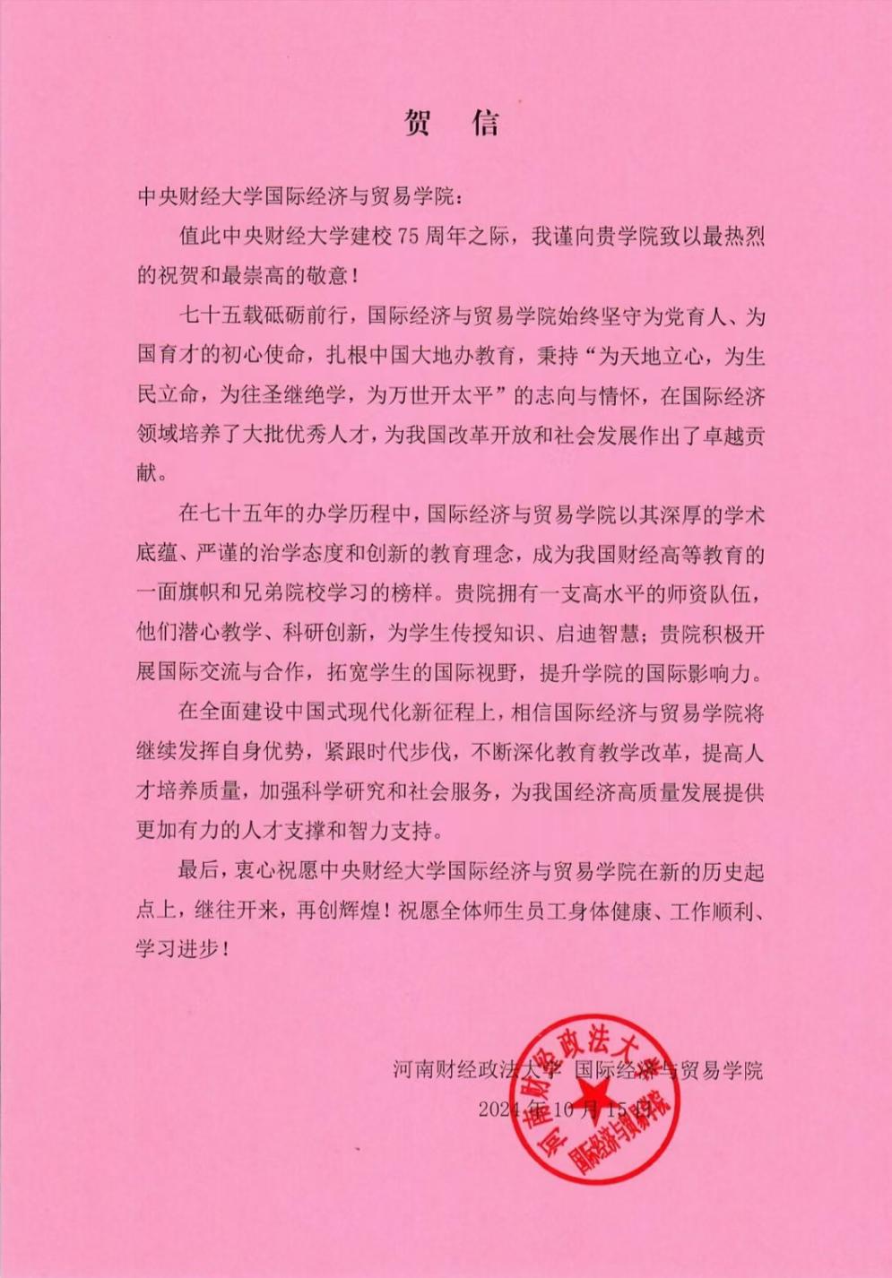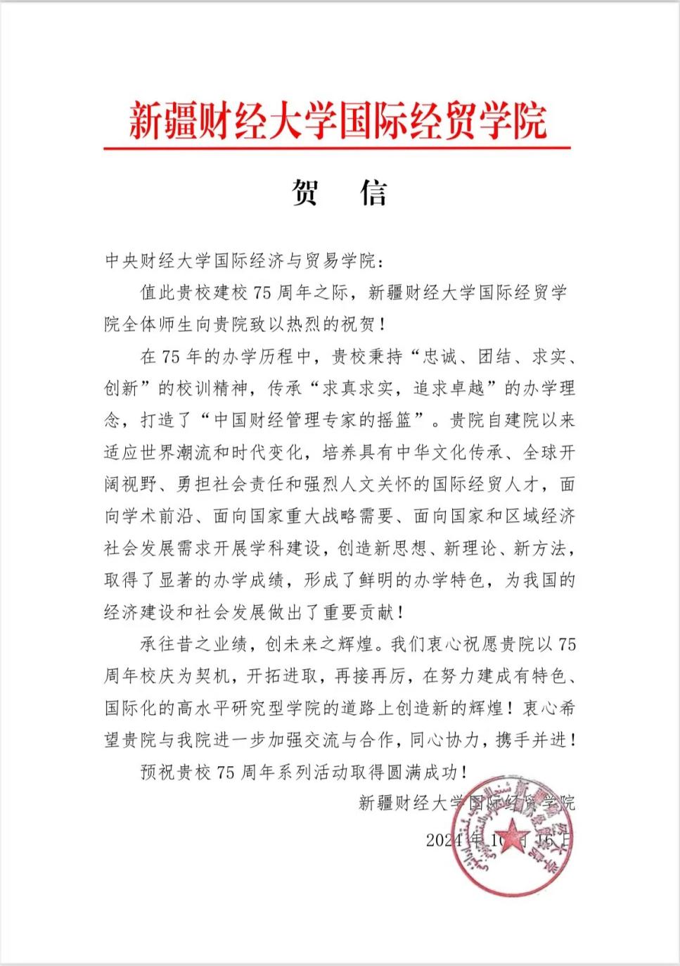七十五載弦歌不輟,七十五載春華秋實。2024年,中央財經(jīng)大學(xué)迎來75周年華誕,學(xué)校和學(xué)院的發(fā)展離不開社會各界朋友的關(guān)心和支持。10月16日下午,國際經(jīng)濟與貿(mào)易學(xué)院收到河南財經(jīng)政法大學(xué)國際經(jīng)濟與貿(mào)易學(xué)院、新疆財經(jīng)大學(xué)國際經(jīng)貿(mào)學(xué)院、大連瀚聞資訊有限公司、廣東金嶺糖業(yè)集團有限公司為我校校慶75周年發(fā)來的賀信。這是我院收到社會各界發(fā)來的第一批賀信。