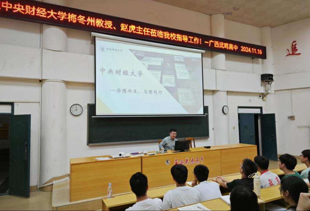 11月16日-18日,招生宣傳組赴廣西武鳴高中、百色高級中學開展招生宣講活動。在兩校的宣講中,梅冬州教授做了題為《從國家發(fā)展看個人成長》的主題講座,他在講座中指出,黨的二十大報告引領我們實現(xiàn)第二個百年奮斗目標,以中國式現(xiàn)代化全面推進中華民族偉大復興。他通過對比阿根廷、韓國等國家的基本情況,揭示要順利實現(xiàn)由中等收入跨步到發(fā)達經(jīng)濟體,需要預防金融危機的爆發(fā),降低地區(qū)差距實現(xiàn)共同富裕,并由此引出對同學們在個人成長過程中的建議,鼓舞同學們滿懷信心、補齊短板、腳踏實地地前進。梅教授從部分經(jīng)濟學基本概念與原理出發(fā),帶領兩所高中的同學們從宏觀經(jīng)濟走向農村教育,由國家發(fā)展反思個人規(guī)劃,獲得同學們的熱烈反響。