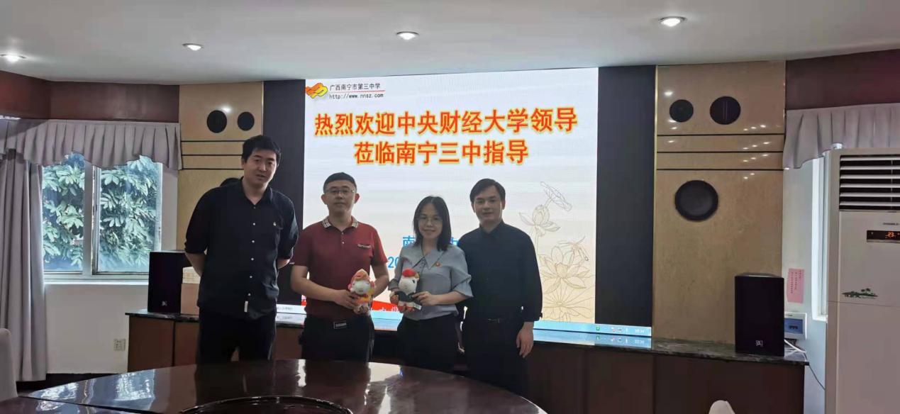 4月23日上午同時(shí),國(guó)際經(jīng)濟(jì)與貿(mào)易學(xué)院符大海副教授和蒙雙老師赴我校優(yōu)質(zhì)生源基地廣西南寧第三中學(xué)進(jìn)行走訪,與校領(lǐng)導(dǎo)和教務(wù)處領(lǐng)導(dǎo)進(jìn)行座談。教務(wù)處戚志濤主任介紹了南寧三中的基本情況、辦學(xué)特色和辦學(xué)成果,符大海副教授介紹了中央財(cái)經(jīng)大學(xué)基本情況、辦學(xué)特色和近年來在廣西的招生情況,雙方進(jìn)一步就未來的深入交流提出展望,希望未來在學(xué)術(shù)講座、職業(yè)規(guī)劃講座等方面開展合作。