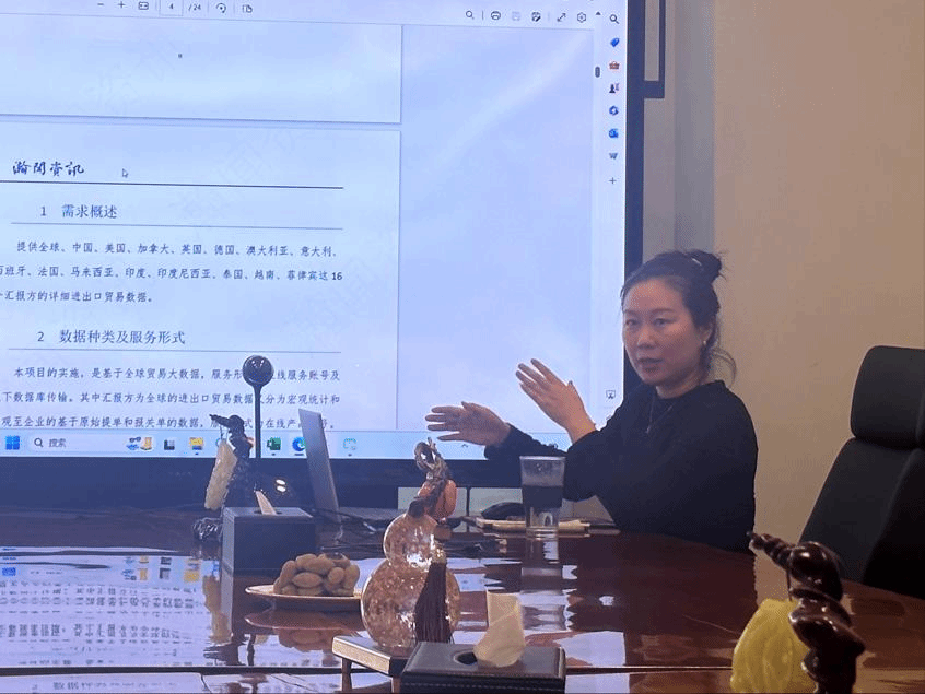 1月10日,張雨微研究員以“數(shù)據(jù)賦能大型企業(yè)”為題,為實習(xí)團(tuán)隊分享了瀚聞資訊為大型企業(yè)提供數(shù)據(jù)服務(wù)的合作機(jī)制及效果。以瀚聞資訊與美的集團(tuán)的合作為例,張研究員向同學(xué)們具體展示了瀚聞資訊的數(shù)據(jù)平臺及數(shù)據(jù)分析服務(wù)如何助力大型企業(yè)在國際貿(mào)易中取得競爭優(yōu)勢,降低經(jīng)營風(fēng)險。