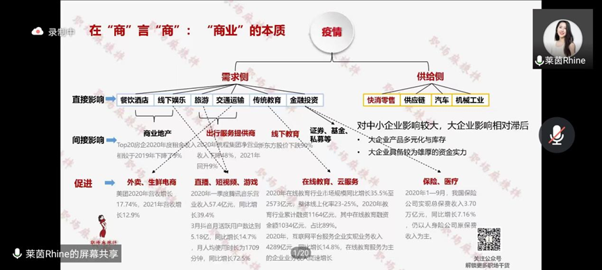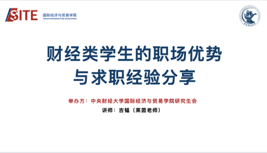 為響應(yīng)同學(xué)們對(duì)于就業(yè)指導(dǎo)的強(qiáng)烈需求,中央財(cái)經(jīng)大學(xué)國(guó)際經(jīng)濟(jì)與貿(mào)易學(xué)院研究生院于4月10日19:00順利舉辦了“財(cái)經(jīng)類(lèi)學(xué)生的職場(chǎng)優(yōu)勢(shì)與求職經(jīng)驗(yàn)”線(xiàn)上指導(dǎo)講座。本場(chǎng)講座特邀萊茵老師為從核心競(jìng)爭(zhēng)力規(guī)劃的角度向同學(xué)們分享求職經(jīng)驗(yàn)。本次講座由國(guó)際經(jīng)濟(jì)與貿(mào)易學(xué)院研究生會(huì)代表潘盈忱主持,國(guó)際經(jīng)濟(jì)與貿(mào)易學(xué)院李倩老師、趙旭老師出席本次講座,各學(xué)院同學(xué)廣泛地參加了此次活動(dòng)。