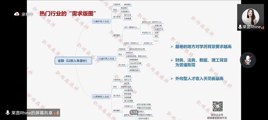 在分析市場(chǎng)對(duì)于求職者的需求方面,萊茵老師提出不同的行業(yè)處于不同的生命周期階段,因此對(duì)于求職者的需求也有所不同。老師代表性地為同學(xué)們分析了金融行業(yè)、互聯(lián)網(wǎng)以及快消行業(yè)的人才需求現(xiàn)狀。