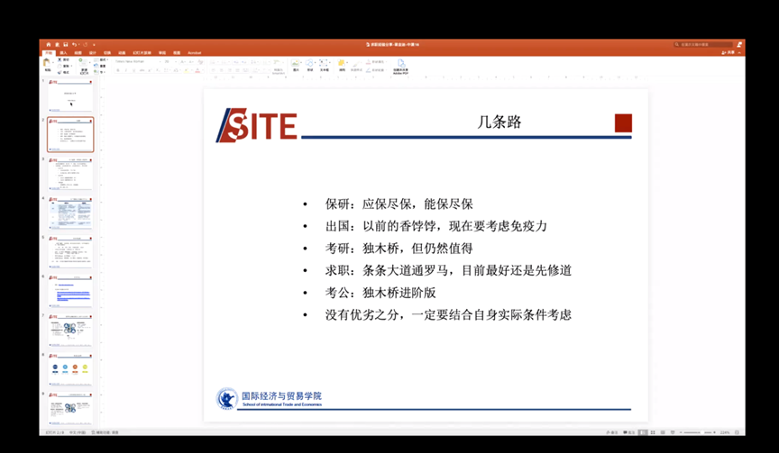 程源學(xué)長從工作收獲和就業(yè)與留學(xué)的權(quán)衡比較兩方面進(jìn)行了分享。程學(xué)長首先從面試細(xì)節(jié)與人際交往等細(xì)節(jié)入手,向同學(xué)們展示了職場新人應(yīng)如何在工作中成長。隨后程學(xué)長為同學(xué)們介紹了投行內(nèi)核部門的具體業(yè)務(wù),讓同學(xué)們得以領(lǐng)略投行工作的成長性與充實感。最后,程學(xué)長回顧自己的求學(xué)與工作經(jīng)歷,叮囑同學(xué)們留學(xué)與工作之間要盡早做出規(guī)劃,堅定不移地走好自己的路。