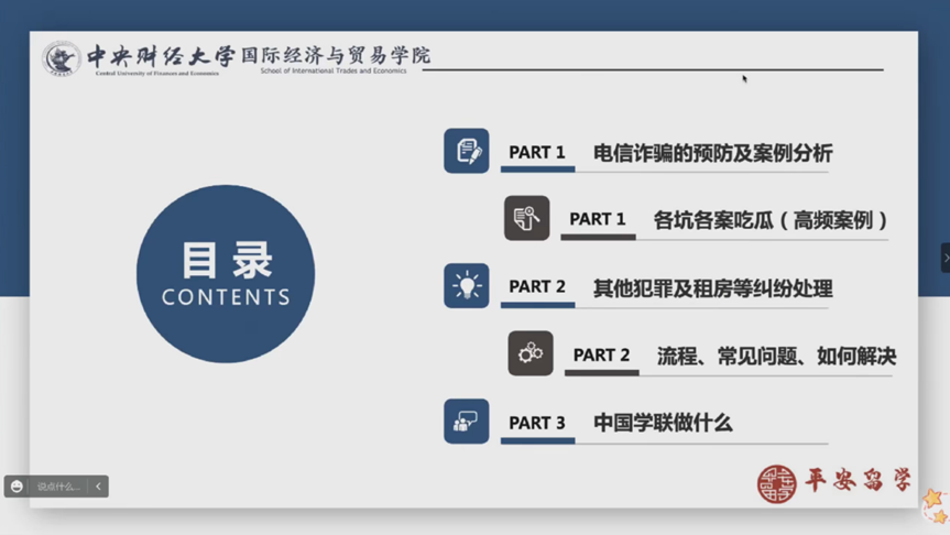 在第一部分中,趙老師從電信詐騙分類剖析與預(yù)防處理措施兩方面向同學(xué)們講述了出國留學(xué)中保護(hù)自己人身財(cái)產(chǎn)安全的寶貴經(jīng)驗(yàn)。