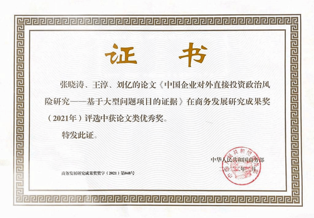 我院張曉濤教授(第一作者)及合作者的論文《中國企業(yè)對(duì)外直接投資政治風(fēng)險(xiǎn)研究—基于大型問題項(xiàng)目的證據(jù)》在2021年商務(wù)發(fā)展研究成果獎(jiǎng)評(píng)選中獲論文類優(yōu)秀獎(jiǎng)。該篇論文發(fā)表于《中央財(cái)經(jīng)大學(xué)學(xué)報(bào)》2020年第1期,論文第二作者王淳為我院2017屆國際商務(wù)碩士畢業(yè)生,論文第三作者劉億為我院2020屆國際貿(mào)易學(xué)博士畢業(yè)生。該篇論文是張曉濤教授團(tuán)隊(duì)在OFDI與中國企業(yè)國際化領(lǐng)域、“一帶一路”經(jīng)貿(mào)合作領(lǐng)域的系列研究成果之一。