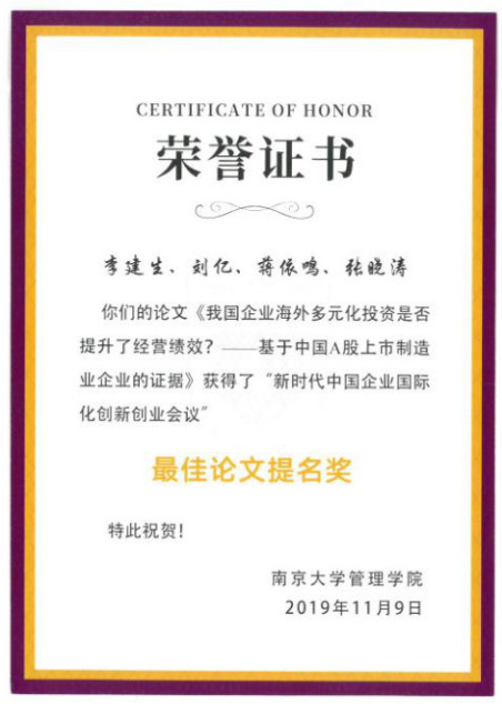 該論文引起了與會(huì)者熱烈的討論,點(diǎn)評(píng)人指出了論文中存在的問(wèn)題并給出了中肯的修改建議,與會(huì)專(zhuān)家認(rèn)為該論文具有很強(qiáng)的現(xiàn)實(shí)意義,它進(jìn)一步拓展了我國(guó)對(duì)外直接投資領(lǐng)域的相關(guān)研究,最終該論文獲得了“新時(shí)代中國(guó)企業(yè)國(guó)家化創(chuàng)新創(chuàng)業(yè)會(huì)議”最佳論文提名獎(jiǎng)。本次參會(huì)得到中央財(cái)經(jīng)大學(xué)研究生學(xué)術(shù)交流支持計(jì)劃的資助。