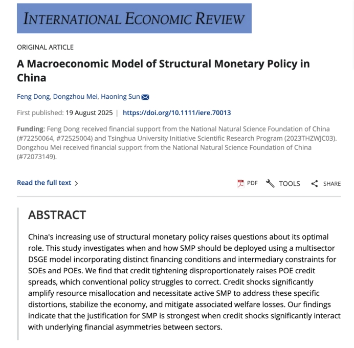 近日,我院梅冬州教授與清華大學(xué)經(jīng)濟(jì)管理學(xué)院董豐教授、清華大學(xué)博士生孫浩寧合作的論文“A Macroeconomic Model of Structural Monetary Policy in China”在國(guó)際經(jīng)濟(jì)學(xué)理論頂級(jí)期刊International Economic Review正式發(fā)表,該期刊屬于中央財(cái)經(jīng)大學(xué)英文期刊目錄AAA級(jí)。