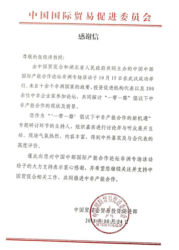 圖:中國貿促會投資促進部發(fā)來的感謝信