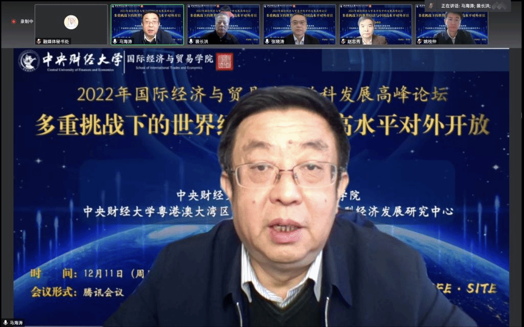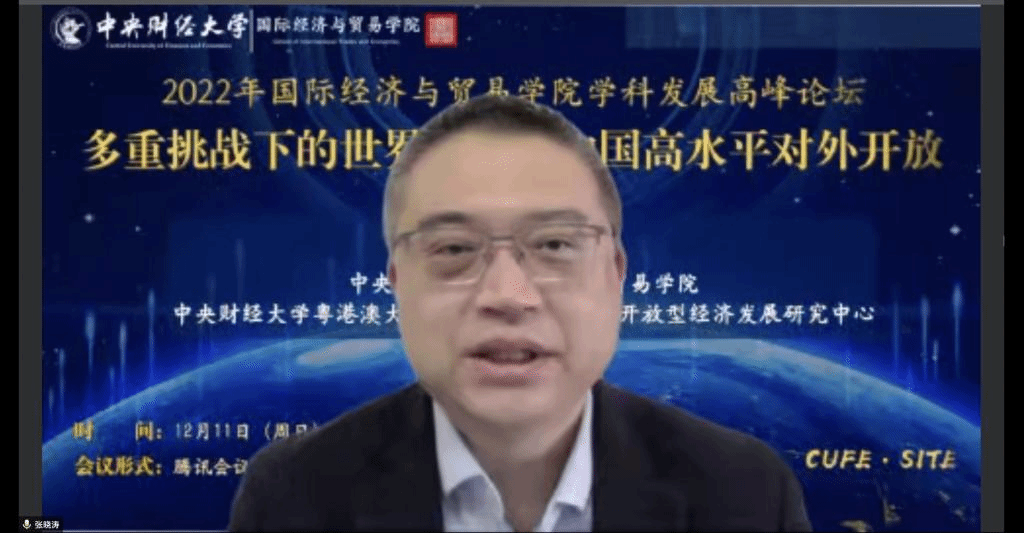 2022年12月11日,中央財(cái)經(jīng)大學(xué)國(guó)際經(jīng)濟(jì)與貿(mào)易學(xué)院與中央財(cái)經(jīng)大學(xué)粵港澳大灣區(qū)(黃埔)研究院開(kāi)放型經(jīng)濟(jì)發(fā)展研究中心聯(lián)合舉辦了2022年學(xué)科發(fā)展高峰論壇,本次高峰論壇的主題為“多重挑戰(zhàn)下的世界經(jīng)濟(jì)與中國(guó)高水平對(duì)外開(kāi)放”,來(lái)自中國(guó)社會(huì)科學(xué)院、山東財(cái)經(jīng)大學(xué)、對(duì)外經(jīng)濟(jì)貿(mào)易大學(xué)等特邀嘉賓以及校內(nèi)外師生近百人通過(guò)線上會(huì)議的方式參與了本次研討會(huì)。