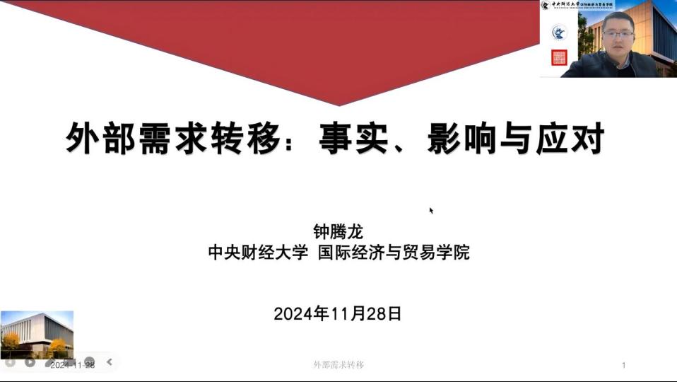 鐘騰龍(中央財經大學國際經濟與貿易學院副教授、國際貿易系主任)做了題為《外部需求轉移:事實,影響與應對》的專題報告:
