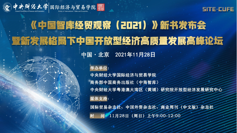 2021年11月28日,中央財經大學國際經濟與貿易學院、中國商務出版社(中商智庫)、中央財經大學粵港澳大灣區(qū)(黃埔)研究院開放型經濟發(fā)展研究中心聯(lián)合舉辦了《中國智庫經貿觀察(2021)》新書發(fā)布會暨新發(fā)展格局下中國開放型經濟高質量發(fā)展高峰論壇,來自中國社科院、北京大學、中國人民大學、南開大學、對外經濟貿易大學、中央財經大學等特邀嘉賓及校內外師生二百余人通過線上會議和觀看直播的方式參與了本次活動。