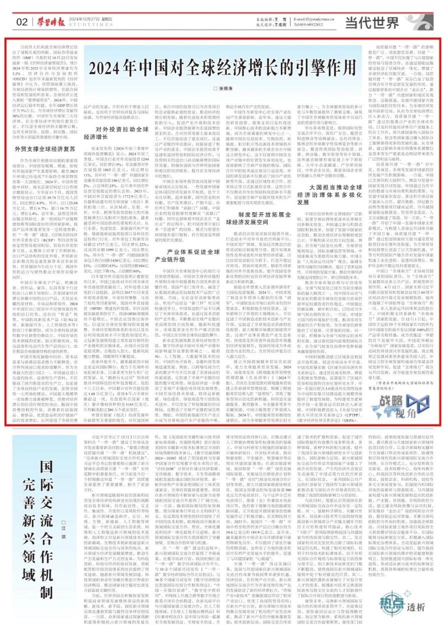 近日,我院張曉濤教授發(fā)表文章《2024年中國對全球經(jīng)濟(jì)增長的引擎作用》,原文刊載于《學(xué)習(xí)時(shí)報(bào)》2024年12月27日第A2版。