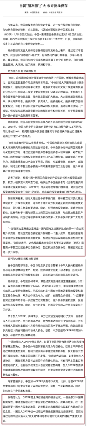 張曉濤認(rèn)為,CPTPP是全球標(biāo)準(zhǔn)最高的貿(mào)易協(xié)議,一些條款對中國具有挑戰(zhàn)性,申請進(jìn)程核心在于中國深化改革的決心、成效與趨勢,在一些領(lǐng)域需要中國全方位推進(jìn)改革,這些都是未來我國深化改革擴(kuò)大開放的必經(jīng)之路。中國加入CPTPP這一過程會有復(fù)雜的國際政治經(jīng)濟(jì)博弈,國際地緣政治的風(fēng)起云涌以及“黑天鵝”事件等都可能對此談判的進(jìn)程產(chǎn)生較大影響。
