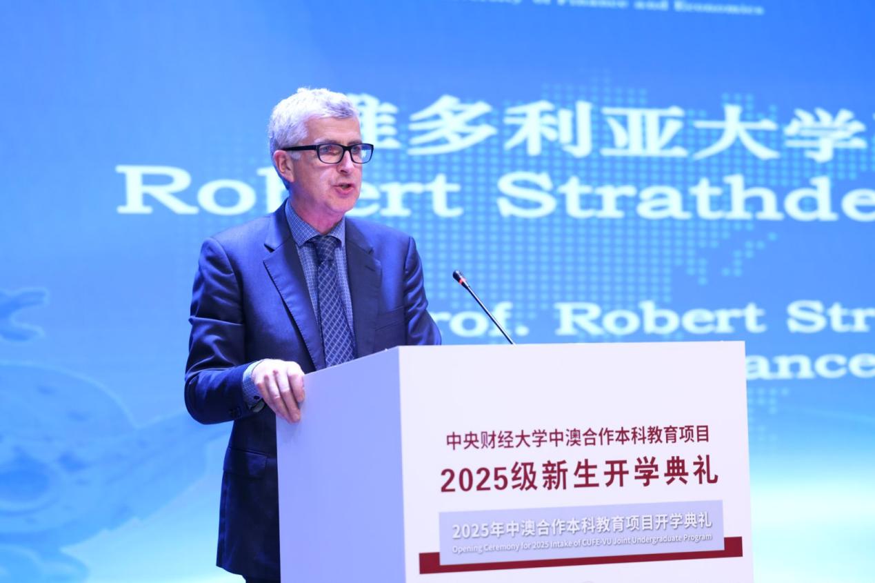 維多利亞大學(xué)副校長羅伯·斯特拉蒂教授致辭。他代表維多利亞大學(xué)校長及全體教職員工,向2025級新生表示最熱烈的歡迎與誠摯的祝賀。中澳項(xiàng)目作為高水平合作辦學(xué)平臺,始終致力于為學(xué)生提供中國頂尖的國際教育體驗(yàn),不僅幫助大家系統(tǒng)掌握前沿的全球知識與專業(yè)能力,也注重引導(dǎo)學(xué)生與祖國的社會文化根基保持緊密聯(lián)系。維多利亞大學(xué)以“多元包容、追求卓越”為核心理念,高度重視每一位學(xué)生的職業(yè)發(fā)展規(guī)劃與實(shí)習(xí)實(shí)踐環(huán)節(jié),辦學(xué)實(shí)力在國際上廣受認(rèn)可,在《泰晤士高等教育》世界大學(xué)排名中穩(wěn)居全球前2%。他衷心希望同學(xué)們充分利用該項(xiàng)目優(yōu)勢,積極構(gòu)建跨文化人際網(wǎng)絡(luò),不斷提升綜合素養(yǎng)與全球競爭力,在多元環(huán)境中鍛煉成長,為未來成為具備國際視野的高素質(zhì)專業(yè)人才打下堅(jiān)實(shí)基礎(chǔ)。